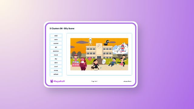 Practice identifying and using sk- beginning consonant cluster vocabulary to build speech and phonics skills through a themed scene activity.