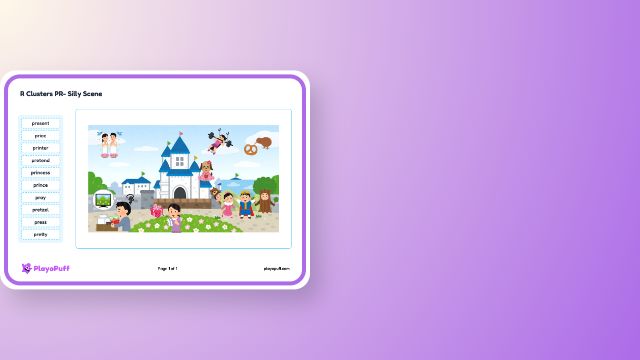 Supports speech sound articulation skills by encouraging children to describe silly scenes using PR cluster words.