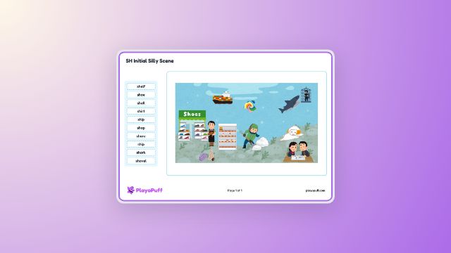 Learners practice identifying and recognizing words that begin with the sh sound through picture-based vocabulary and word matching.