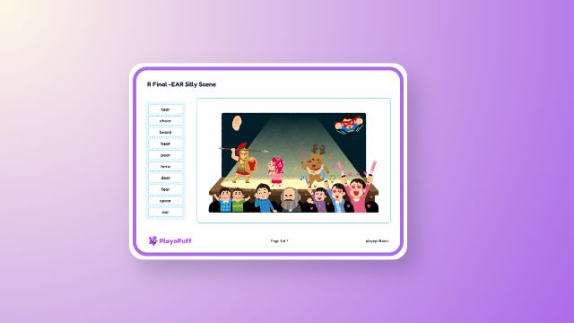 Students practice reading and recognizing words with the final -ear sound while building vocabulary through a themed scene activity.