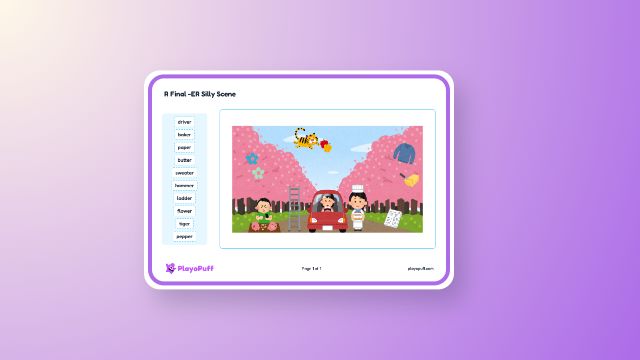Students practice recognizing and reading words with the final -er sound by using common vocabulary in a playful scene activity.
