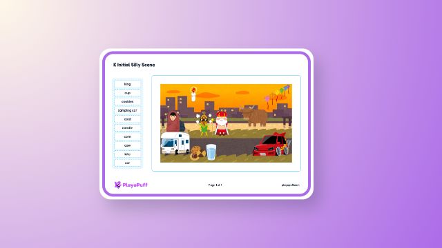 Practice identifying and using initial K words in context to build phonics, articulation, and speech sound awareness.