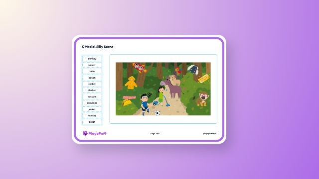 Practice identifying and using medial K words in context to build phonics, articulation, and speech sound awareness.
