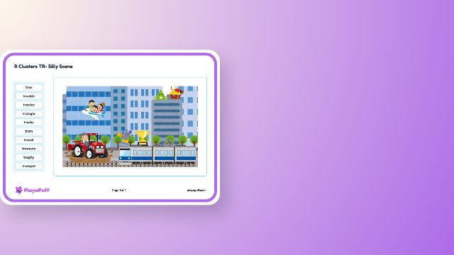 Supports speech sound articulation skills by encouraging children to describe silly scenes using TR cluster words.