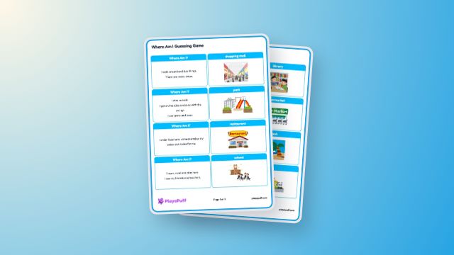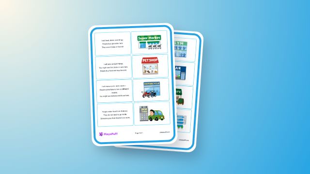 Learners practice reading clues and identifying different community shops and services such as supermarkets, pet shops, gyms, and garages.