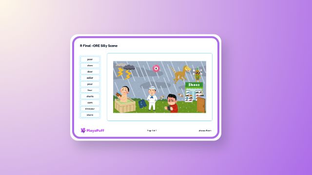 Students practice identifying and using words with the final -ore sound to build speech sound and phonics skills.
